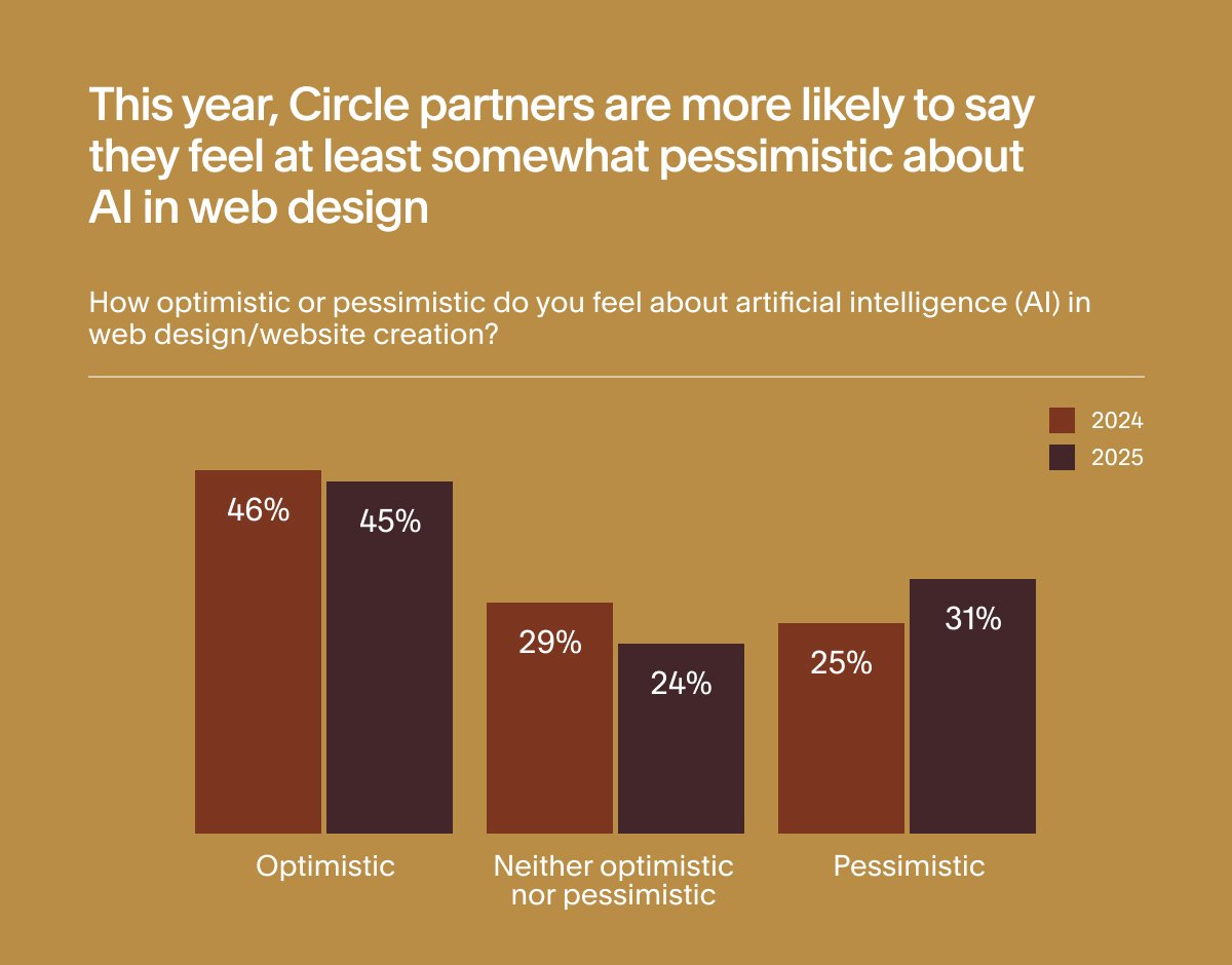 After another year of being bombarded by everything AI, fewer Circle partners find themselves on the fence about it. More are likely to say they’re somewhat or very pessimistic about the role of AI in website creation.