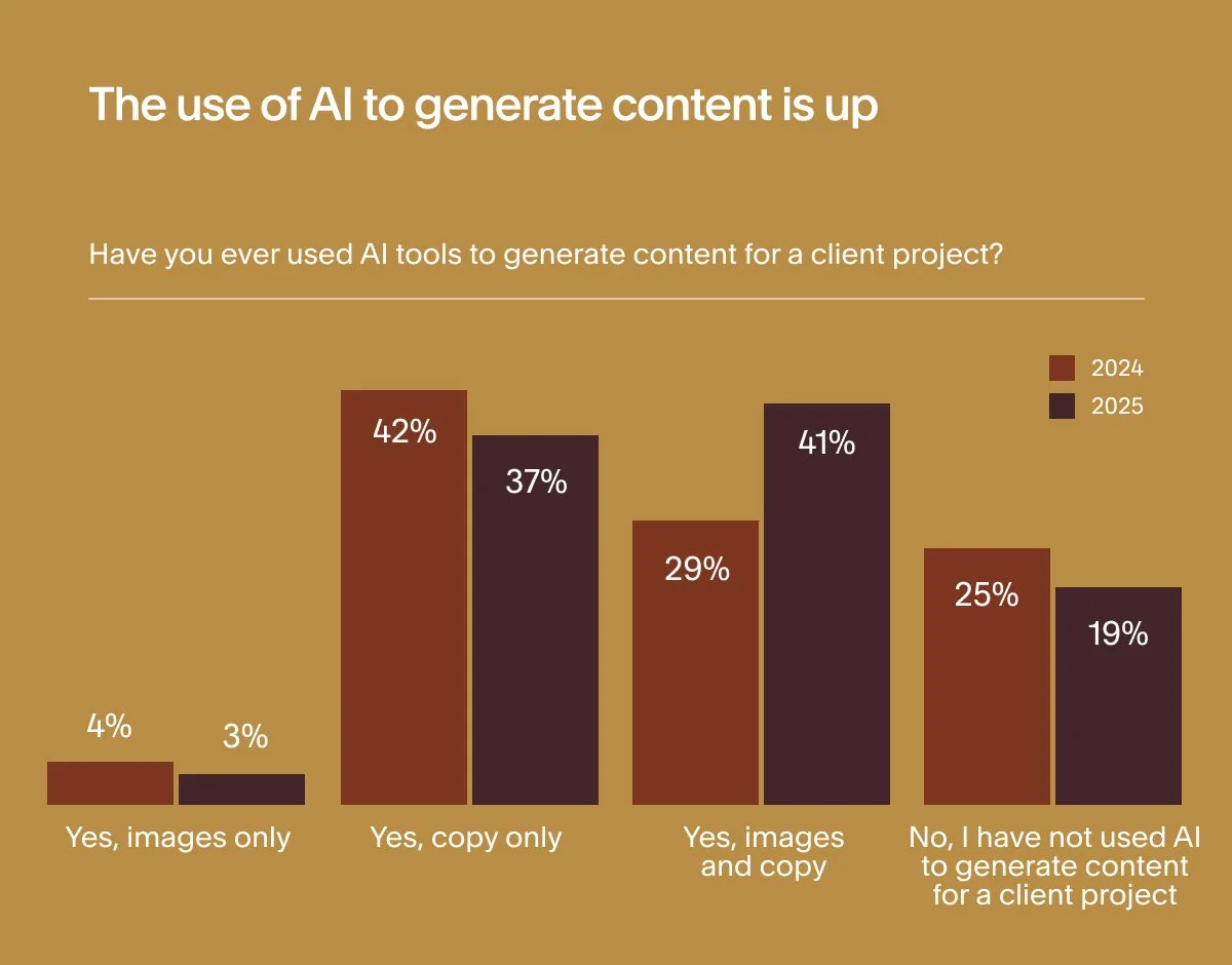 AI doesn’t have to replace creativity, it simply creates more opportunity to focus on deeper conversations, sharper strategy, and more meaningful client collaboration. And while AI use is on the rise for tasks like content creation, only 5% of respondents say they’re “comfortable with AI handling any work-related tasks.” For most, trust, taste, and creative judgment are uniquely human strengths.